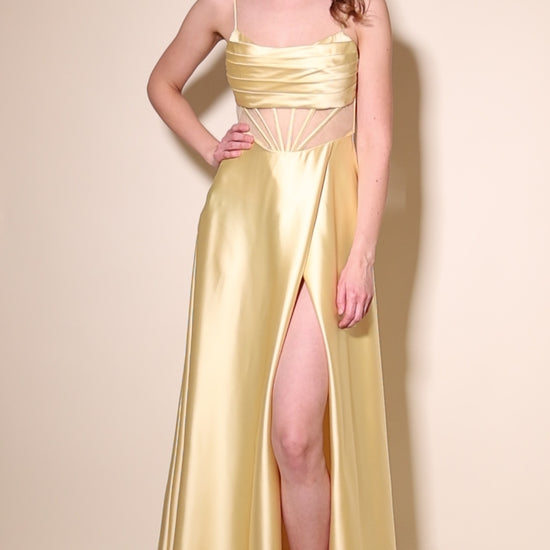 Entdecke unser Ballkleid - Abendkleid mit Schnürung in Gelb. Das halbtransparente Design mit Korsett-Details setzt deine Taille wirkungsvoll in Szene, während der Wasserfallausschnitt deinen Dekolletébereich elegant hervorhebt. Mit seinem exzellenten Sitz und dem eleganten Schlitz bietet dieses Kleid unvergleichliche Bequemlichkeit für jede Gelegenheit.