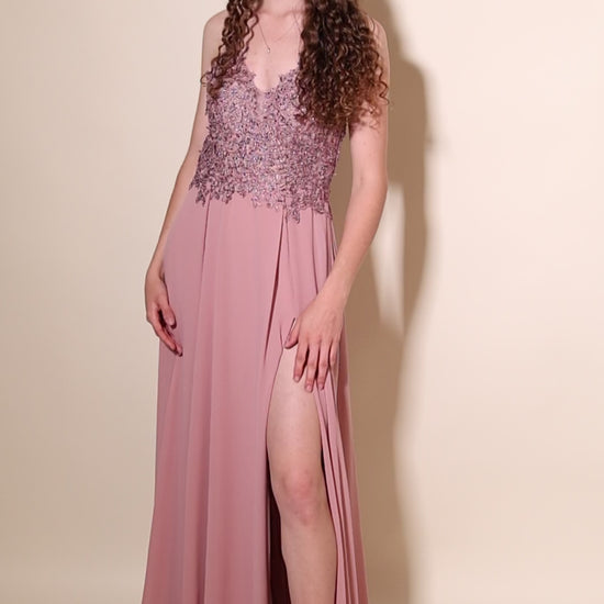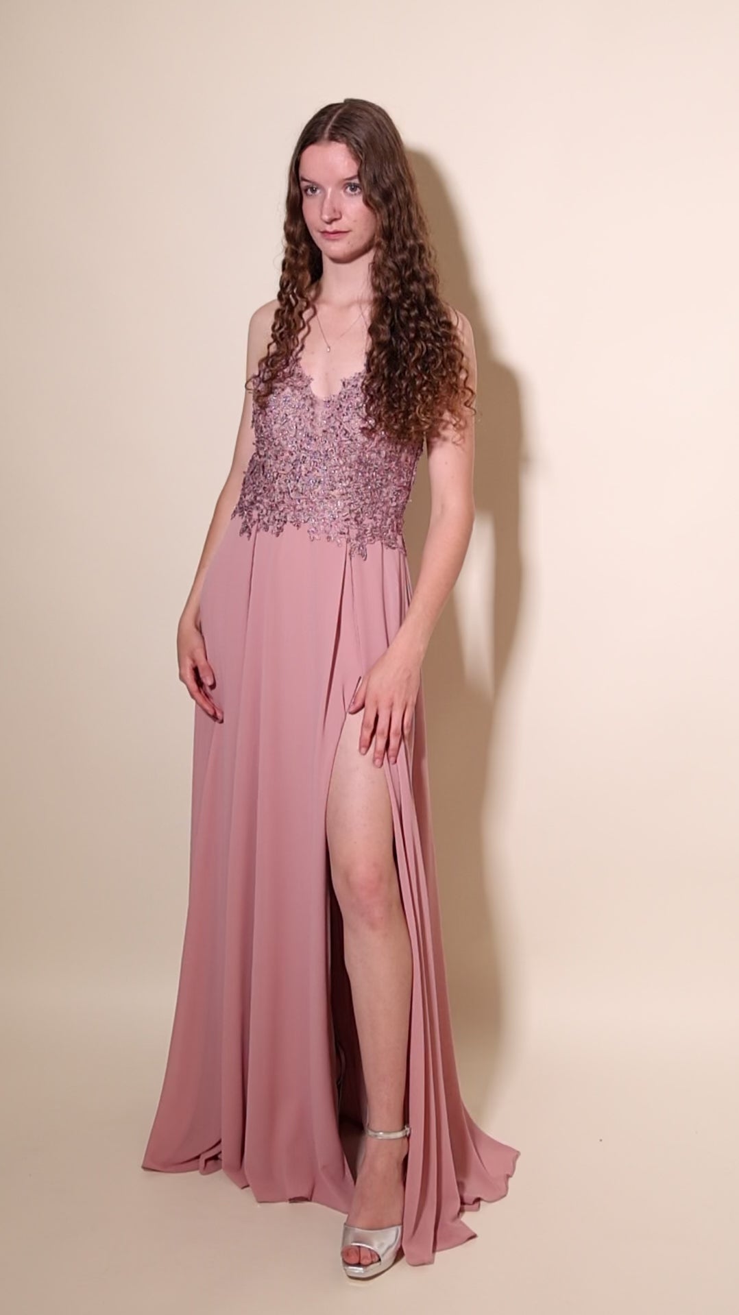 Entdecke unser elegantes Ballkleid in Altrosa. Das moderne Ballkleid besticht durch funkelnde Spitze, einen Schlitz und einen stilvollen V-Ausschnitt. Der tiefe Rückenausschnitt, die Spaghettiträger und der weich fallende Rock verleihen dem Kleid eine besondere Eleganz. Ein Ballkleid für unvergessliche Momente.