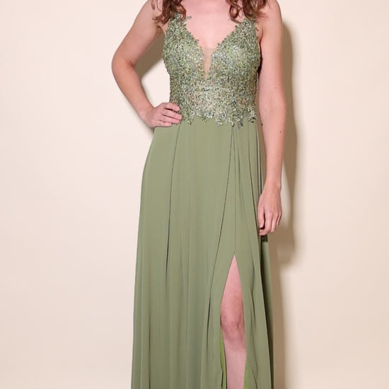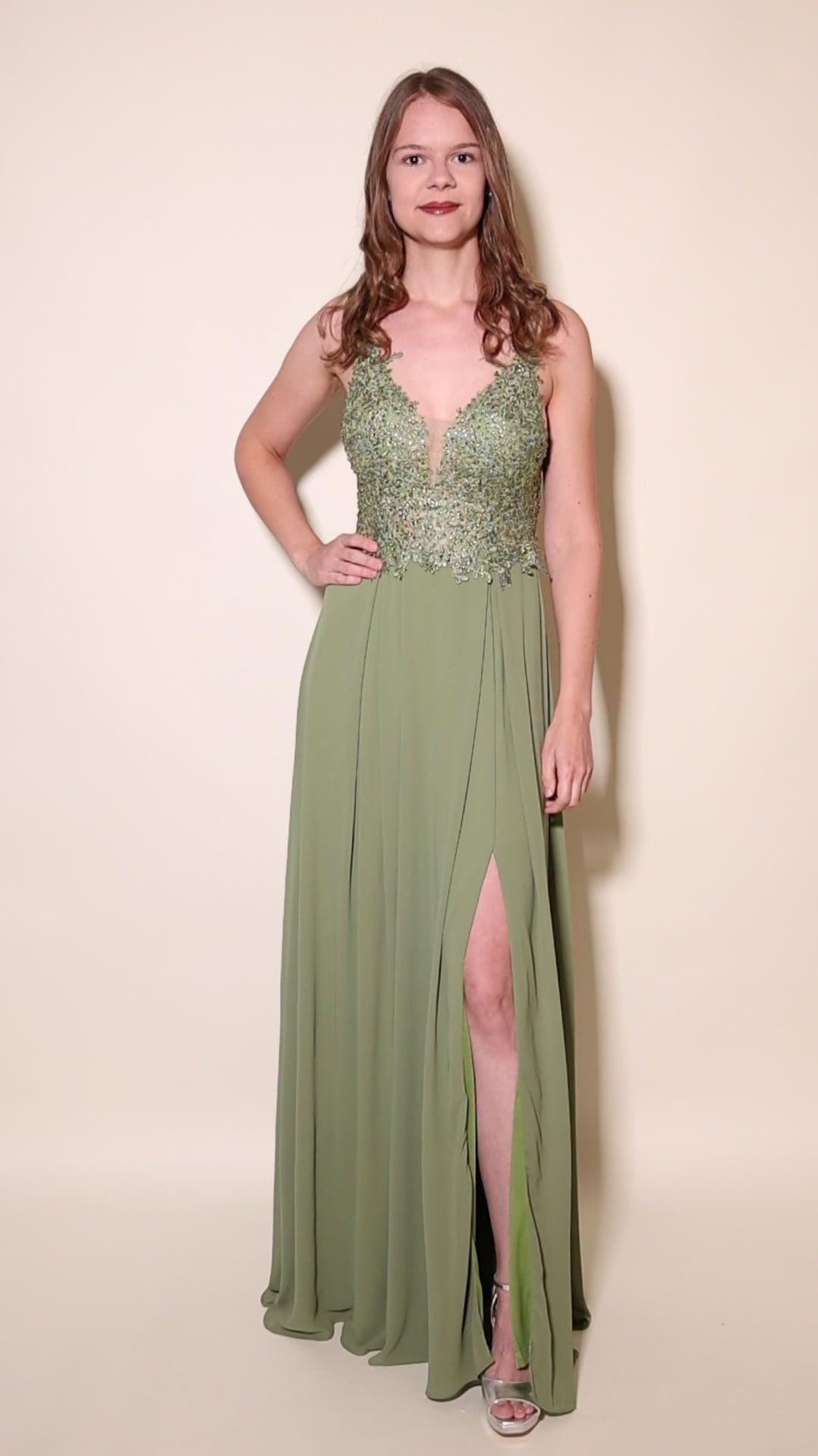 Entdecke unser elegantes Ballkleid in Oliv. Das moderne Ballkleid besticht durch funkelnde Spitze, einen Schlitz und einen stilvollen V-Ausschnitt. Der tiefe Rückenausschnitt, die Spaghettiträger und der weich fallende Rock verleihen dem Kleid eine besondere Eleganz. Ein Ballkleid für unvergessliche Momente.