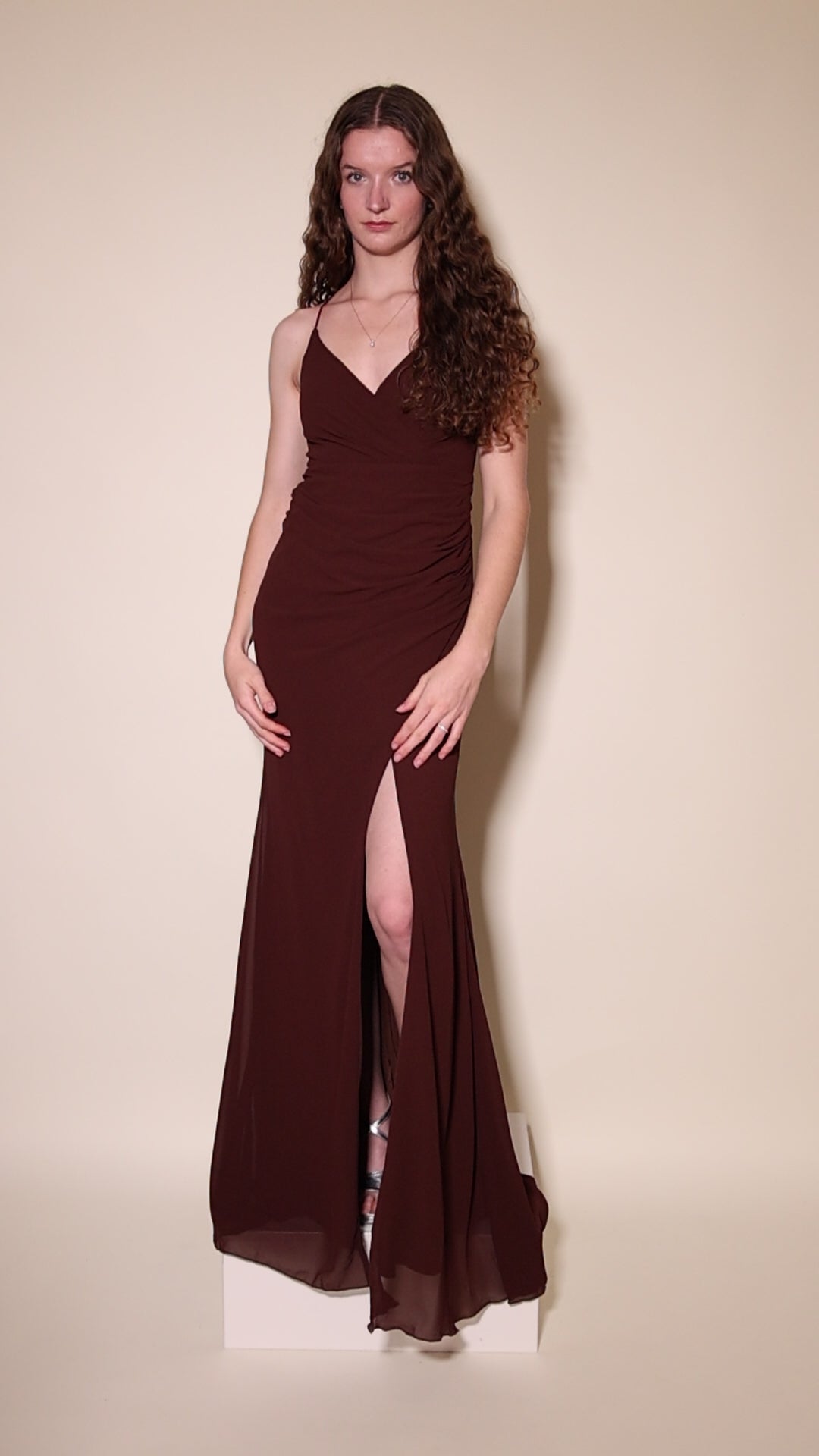 Entdecke unser enganliegendes Chiffon Abendkleid mit Schnürung und Schlitz in Braun. Es ist die perfekte Wahl für dich, wenn du auf der Suche nach einem Abendkleid bist, dass deine Figur gekonnt in Szene setzt. Die Schnürung am Rücken sorgt für eine individuelle Anpassung und eine extra Portion Halt.