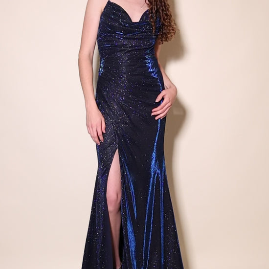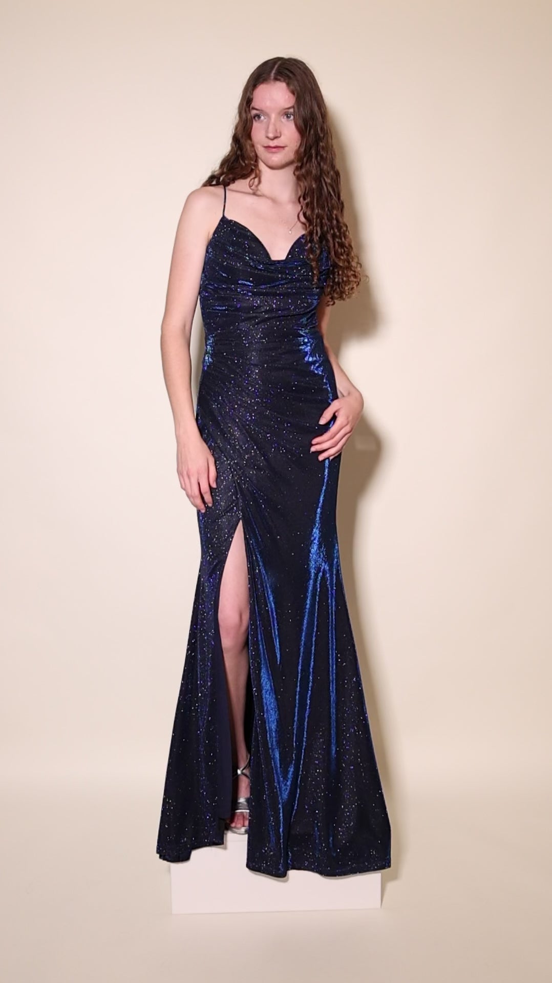 glitzerndes Abiballkleid mit Schnürung & Schlitz, dunkelblau