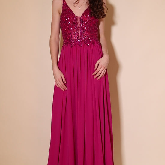 Langes Chiffon-Abendkleid mit Pailletten-Spitze & V-Ausschnitt, pink