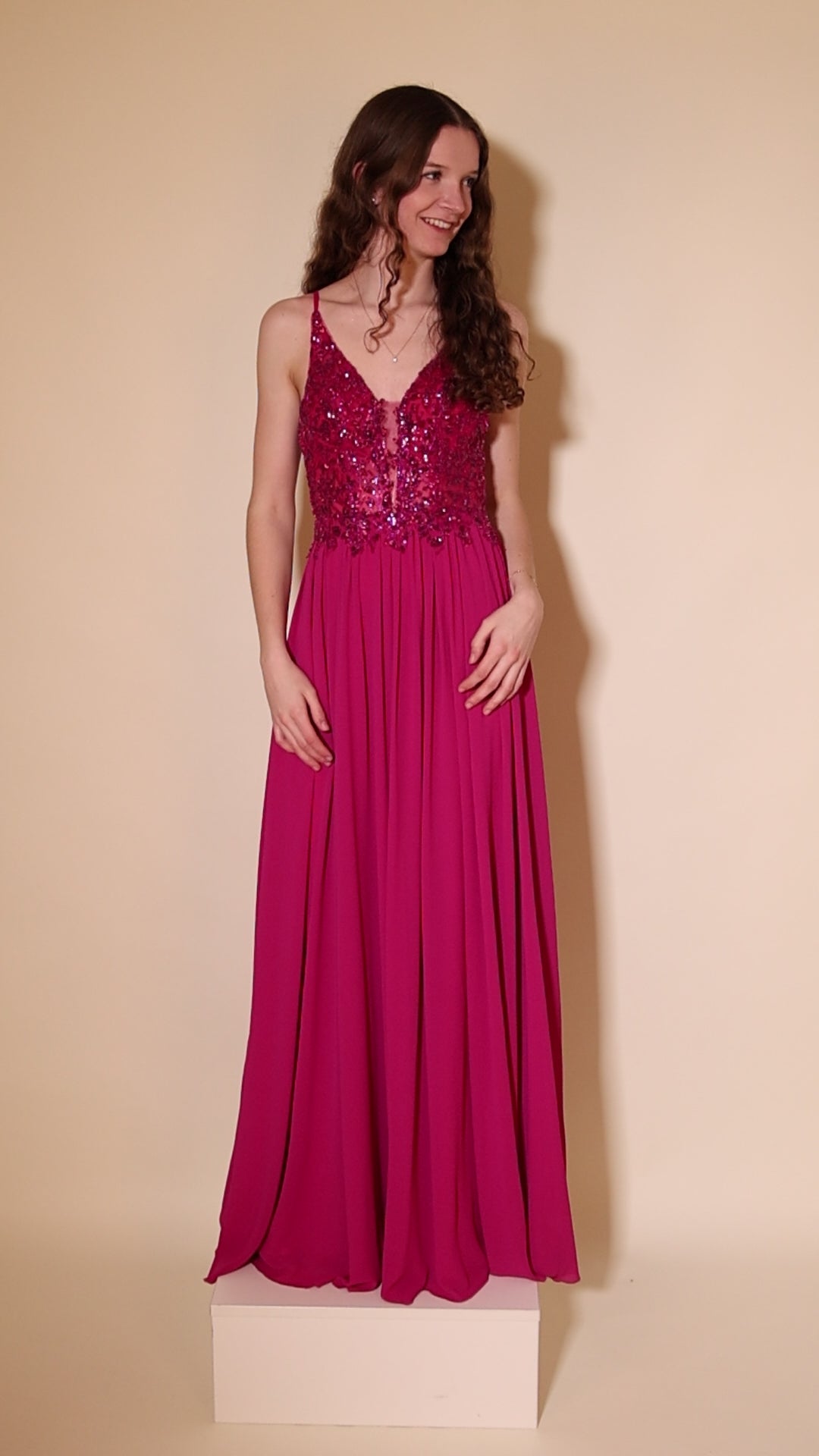 Entdecke unser Chiffon-Abendkleid mit Pailletten-Spitzenoberteil und V-Ausschnitt in Pink. Das Spitzen-Paillettenoberteil hat schmale Spaghettiträger und einen tiefen V-Ausschnitt mit transparentem Einsatz. Das Abendkleid in A-Linie hat einen bodenlangen, fließenden Chiffonrock mit weicher Faltenlegung.