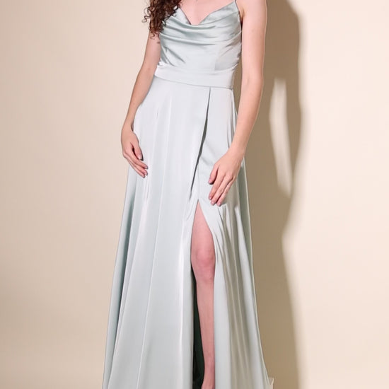 Langes Satin-Abendkleid mit Schlitz und Schnürung, mint