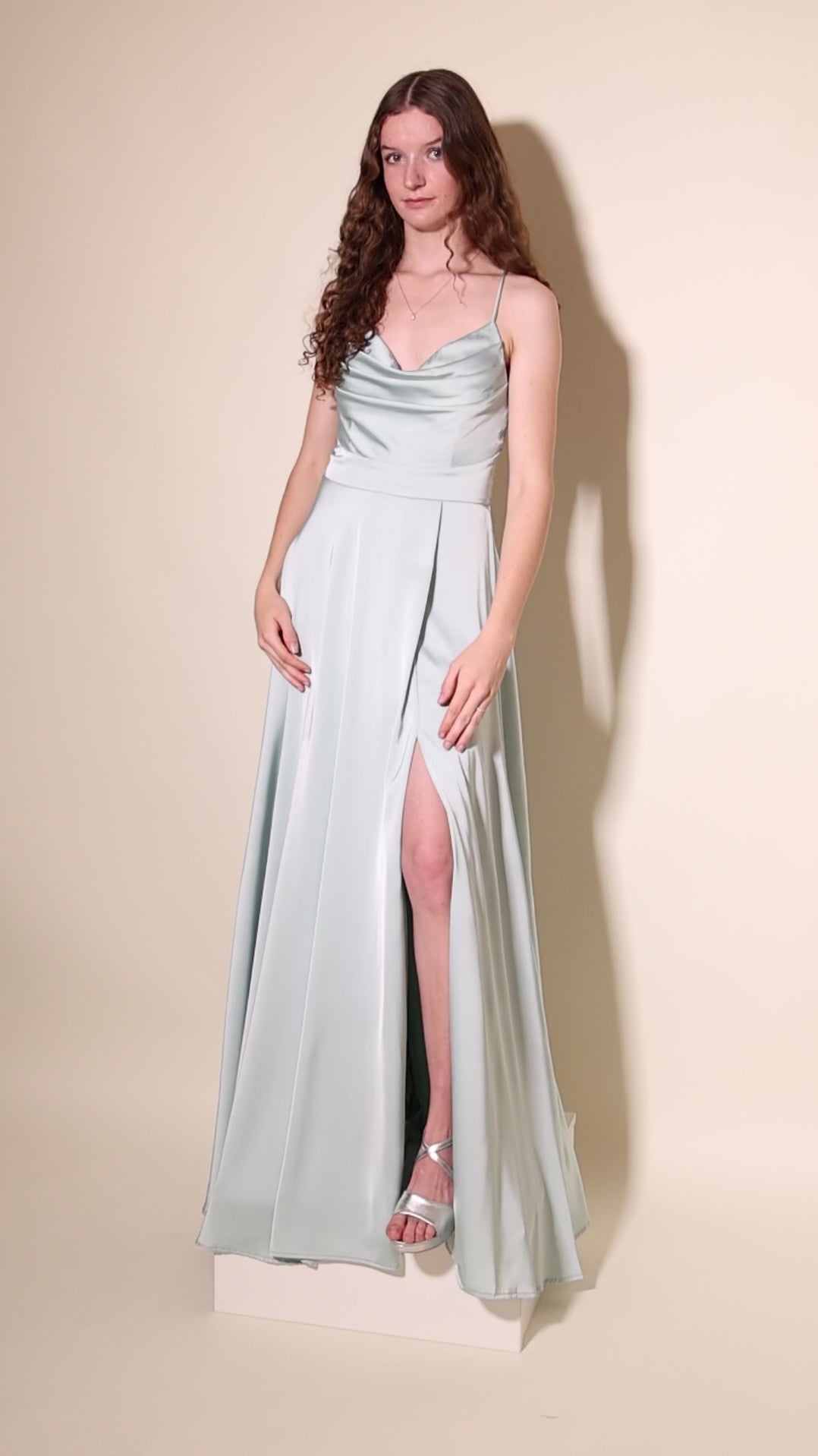 Entdecke unser langes Satin-Abendkleid mit Schlitz und Schnürung in Mint. Der fließende Satin schmiegt sich elegant an deine Silhouette, während die Schnürung für eine perfekte Passform sorgt. Der seitliche Beinschlitz und der sanft glänzende Stoff verleihen dem Kleid eine verführerische und zugleich edle Ausstrahlung.