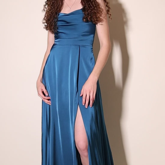 Langes Satin-Abendkleid mit Schlitz und Schnürung, petrol