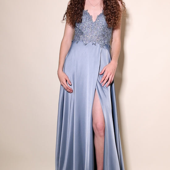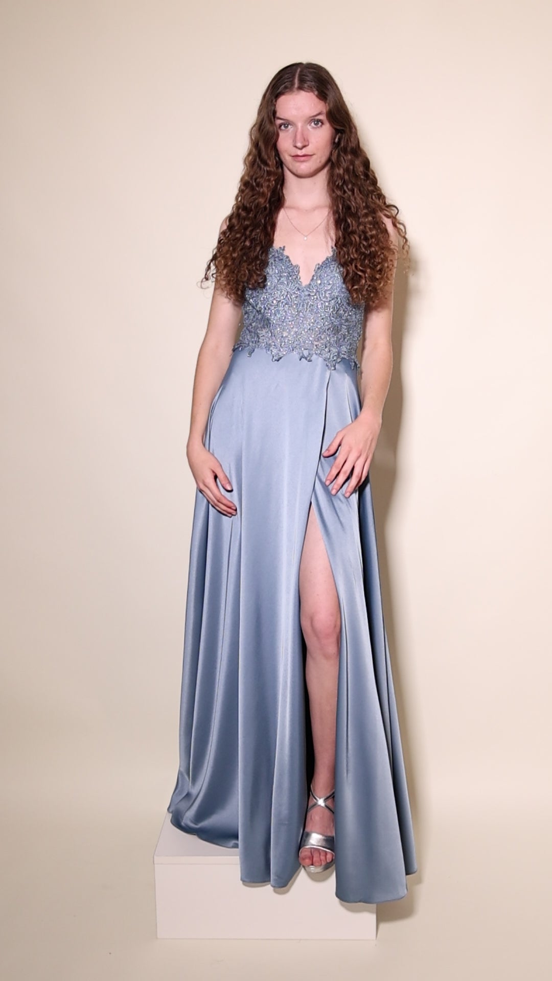 Langes Satinkleid mit Spitze und Schlitz, graublau