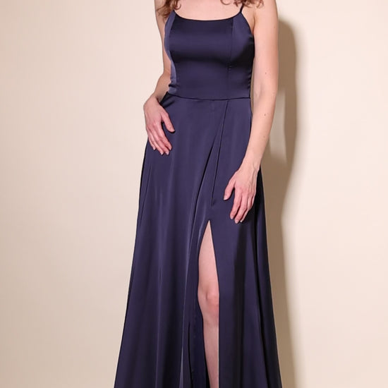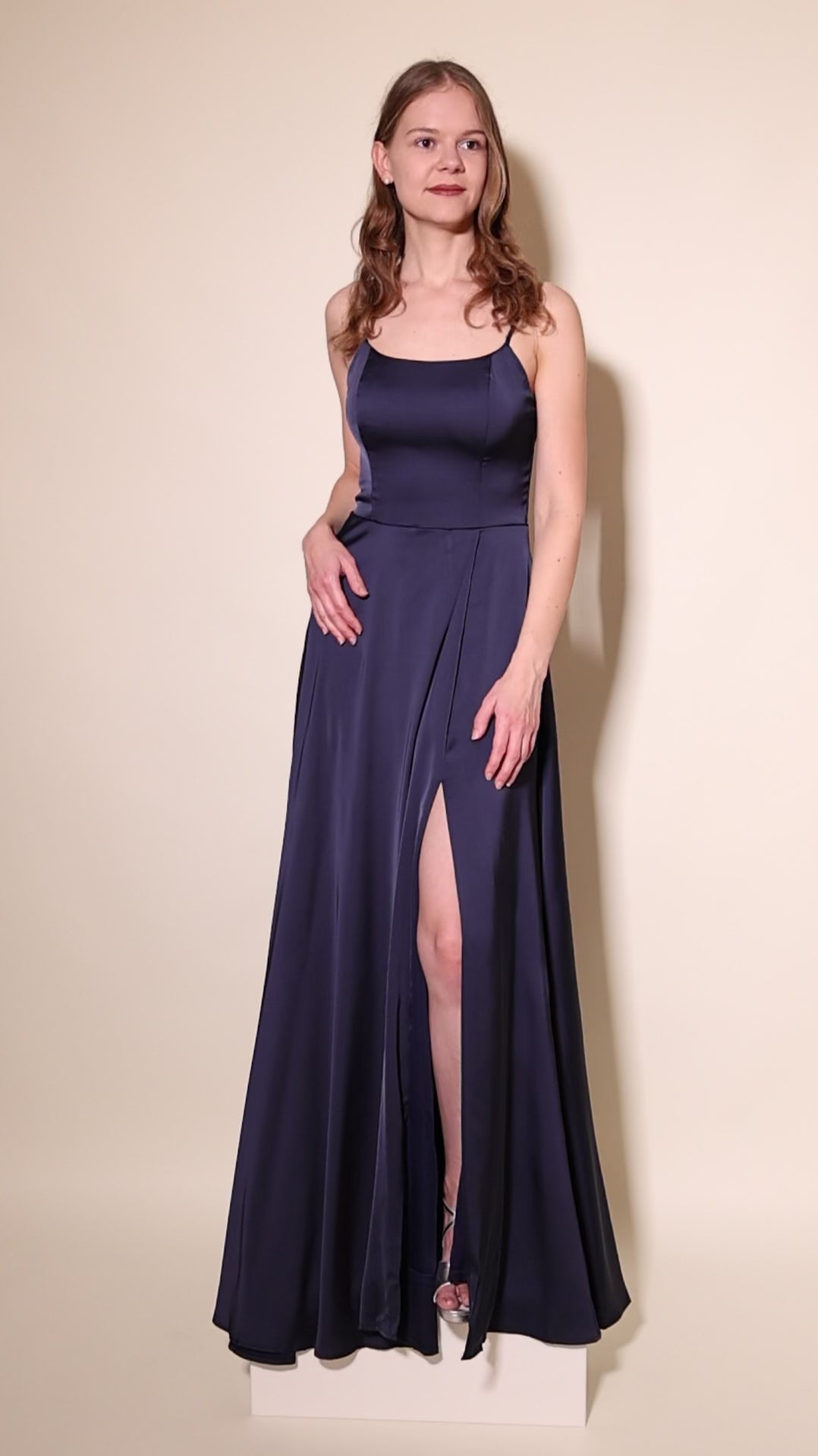 Satinkleid mit geradem Ausschnitt, Schnürung und Schlitz, dunkelblau