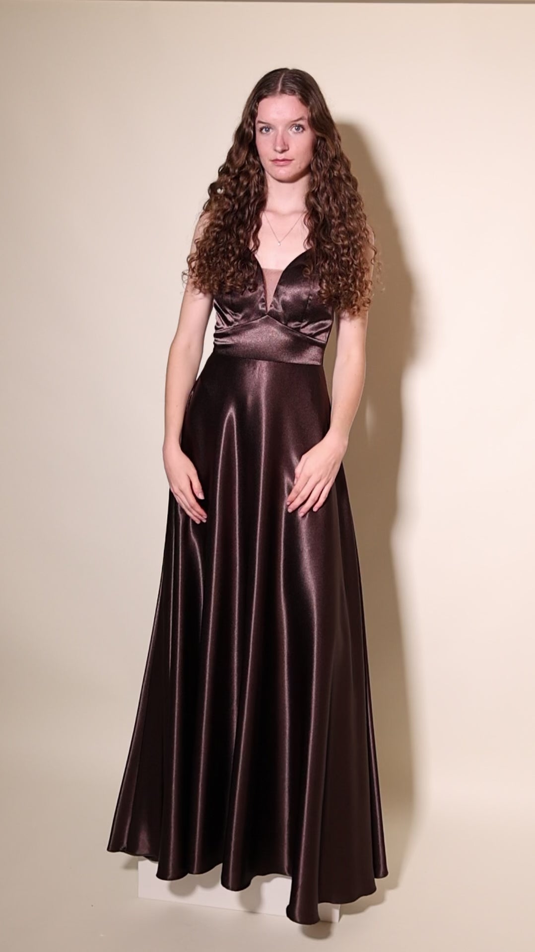 Entdecke unser Satinkleid mit tiefem Herzausschnitt & Spaghettiträgern in Braun. Das Oberteil hat einen eleganten Herzausschnitt mit transparentem Netzeinsatz, schmale Spaghettiträger, welche sich am Rücken kreuzen. Der lange, glatt glänzende Satinrock fällt fließend bis zum Boden ohne Schlitz und sorgt für einen edlen Look.